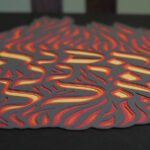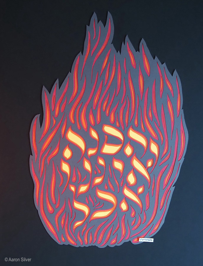 The structural challenge in creating this papercut was to create the many layers of paper so that they enhanced each other, kept the words legible, and created a sense of depth. I decided to allow the yellow to show through only in the letters, making them pop more than all the tiny flames.