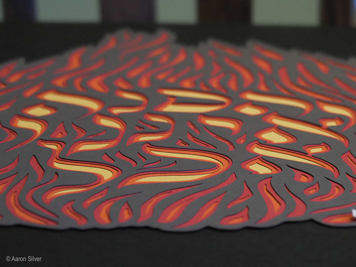 The structural challenge in creating this papercut was to create the many layers of paper so that they enhanced each other, kept the words legible, and created a sense of depth. I decided to allow the yellow to show through only in the letters, making them pop more than all the tiny flames.