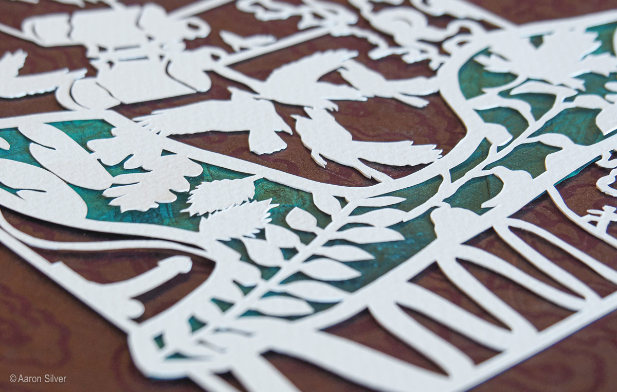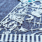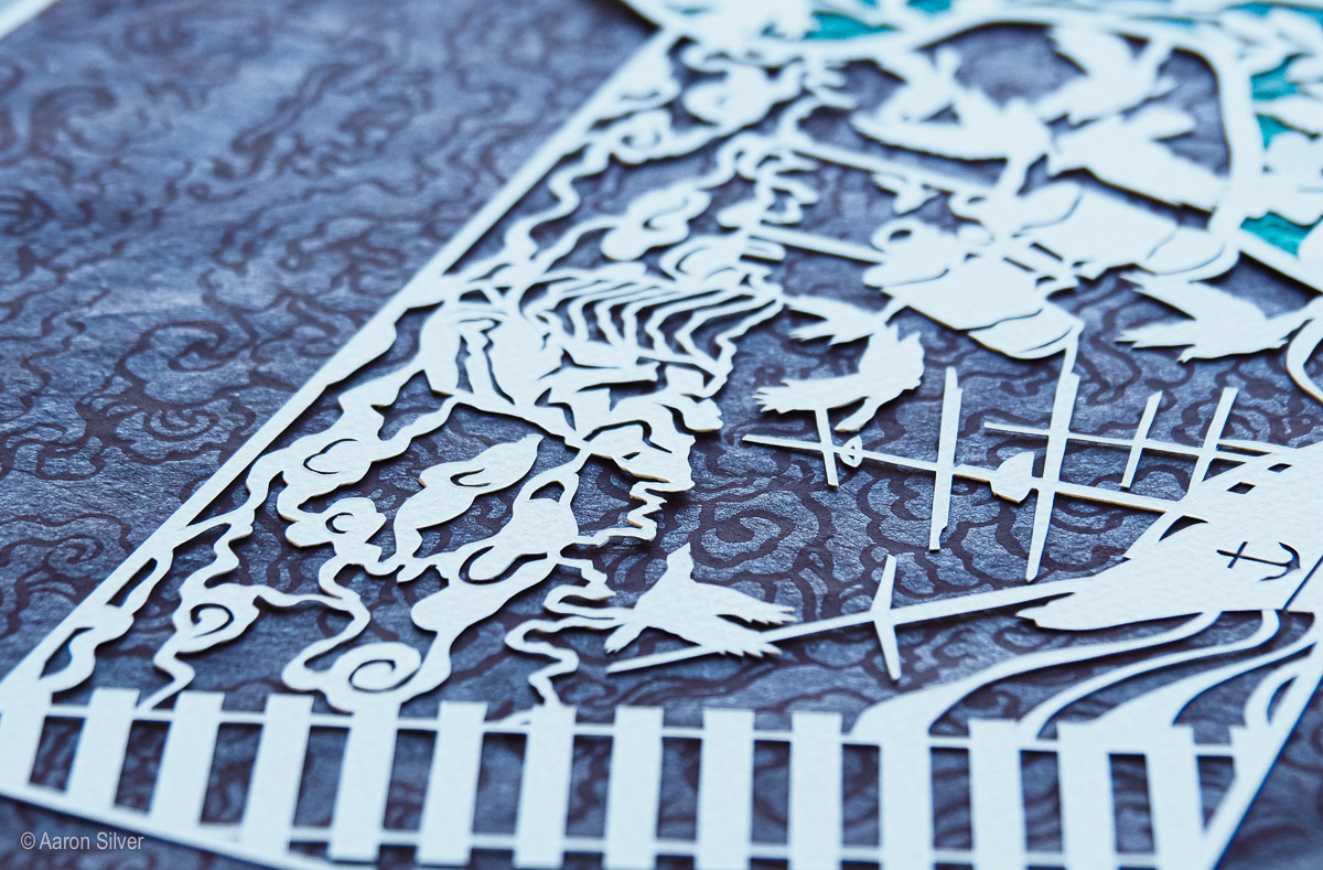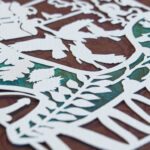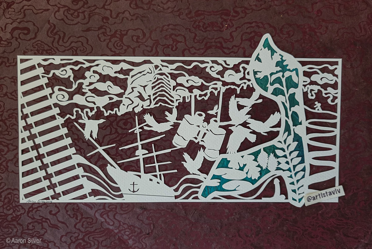 A gift for my husband on our third anniversary (8/8/2025). It features the Hebrew letter Gimel (for 3), as well as some imagery from our third year as a married couple – our two trips to Winona, represented by Sugarloaf Bluff at the top; train tracks representing our trip to Chicago on the train; birds and binoculars because he got kind of into watching and identifying birds; a snaking path and a hiker for our hikes; a phallic art piece I made at his prompting; and the HMS Warrior, a ship we visited when we were in England. The plants inside the Gimel are from our ketubah.