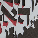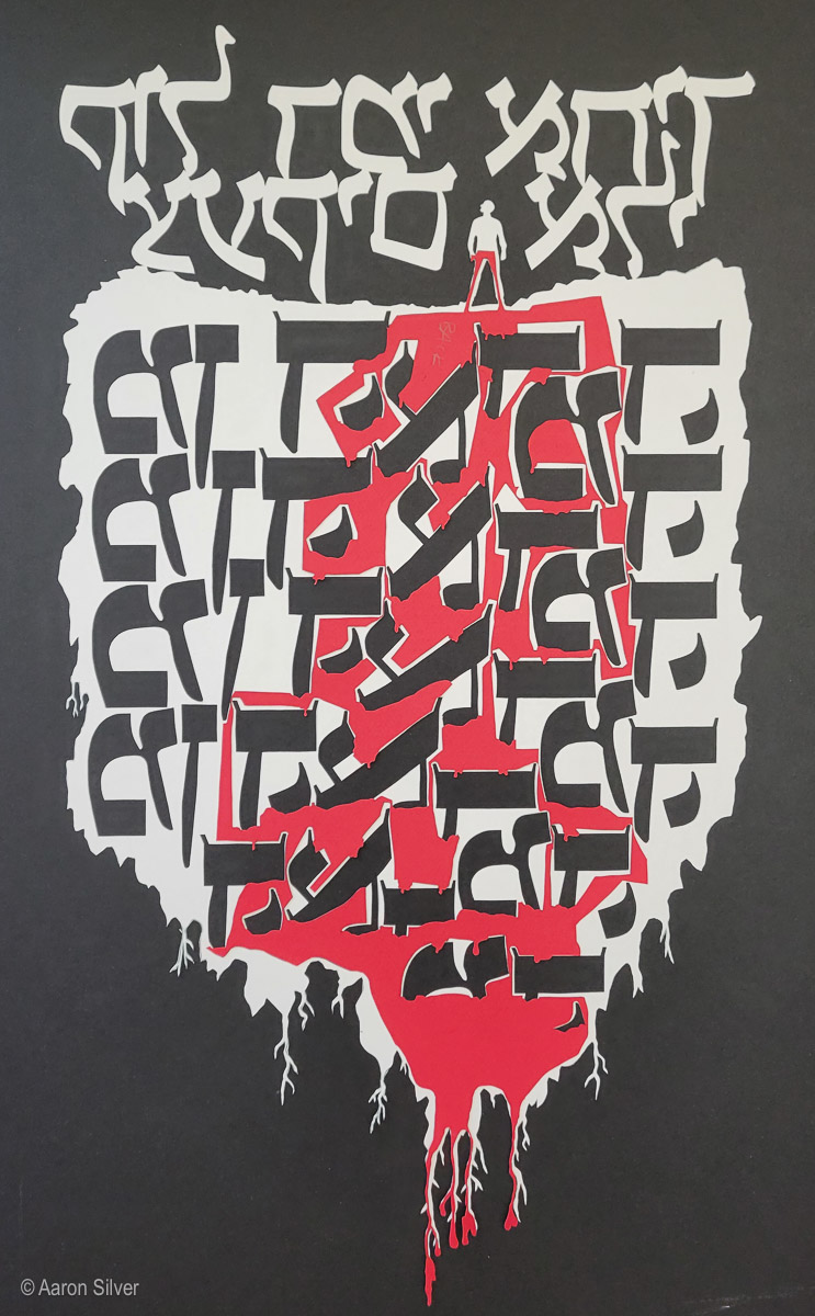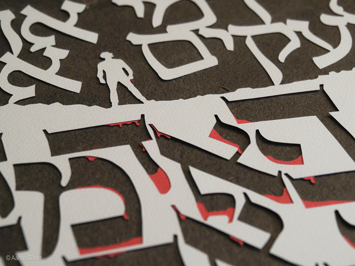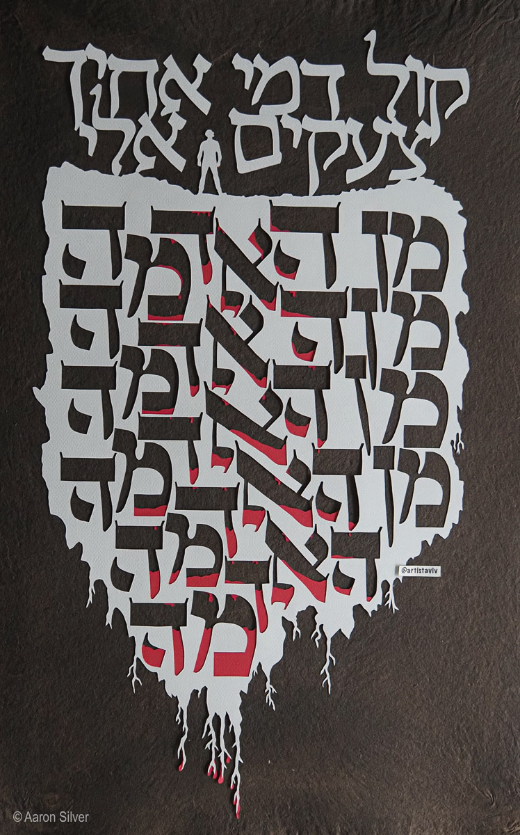 The text in this papercut comes from Genesis 4:10, when God is talking to Cain after Cain has killed Abel and then said to God “Am I my brother’s keeper?” God responds, “What have you done?! The voice of your brother’s blood cries out to Me from the ground.”