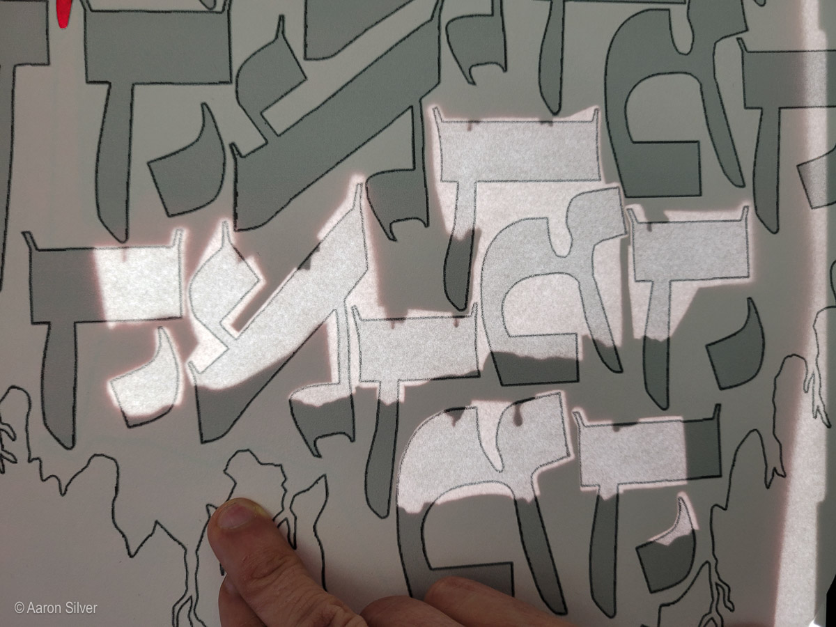 The words “min ha-adamah” or “from the ground” are repeated over and over going down into the earth, as the blood drips down into them. If you look closely, you can see a small drop of blood hanging from Cain’s left hand.