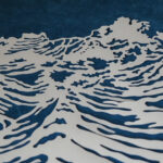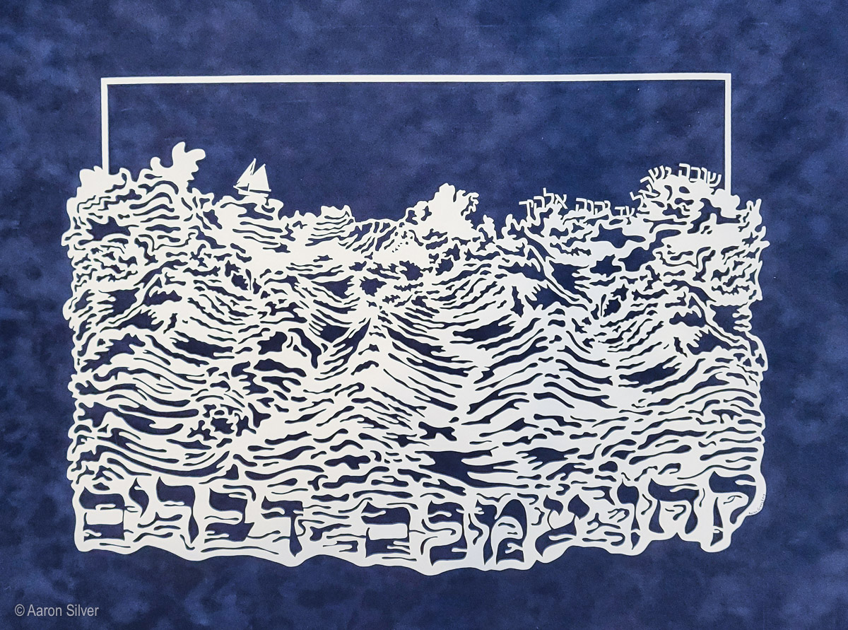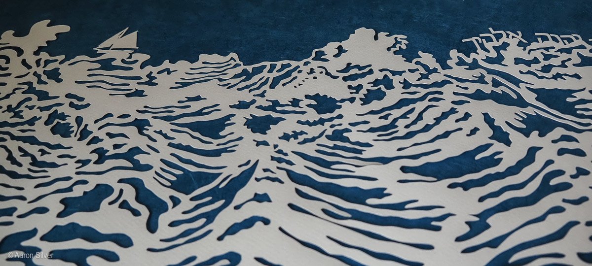 This is my third piece with this text, “take words with you” and “Return, Israel, to the Lord your G!d.” (Hosea, chapter 14) It’s a re-imagining of my second design, with a difference sense of balance and implementation. This one was framed on dark blue suede.