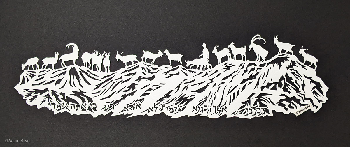 The Hebrew text in this piece comes from Psalm 23:4, and its most commonly known translation is from the King James Version of the bible, “Yea, though I walk through the valley of the shadow of death, I will fear no evil: for Thou art with me.” JPS translates it as “Though I walk through a valley of deepest darkness, I fear no harm, for You are with me.”