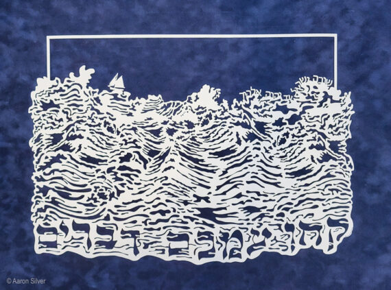 This papercut ketubah, which I designed for a couple here in Brooklyn, incorporates a variety of historical, ideological, and family symbols. One member of the couple has irish history, both are associated with the UAW, they love water and earth, freedom, and the infinte. All these ideas are in here. In the final ketubah, of which I do not yet have a photo, the text fills in the four squares. It’s 22 x 28 inches and has a oil pastel background with red oil paint people. More info here…